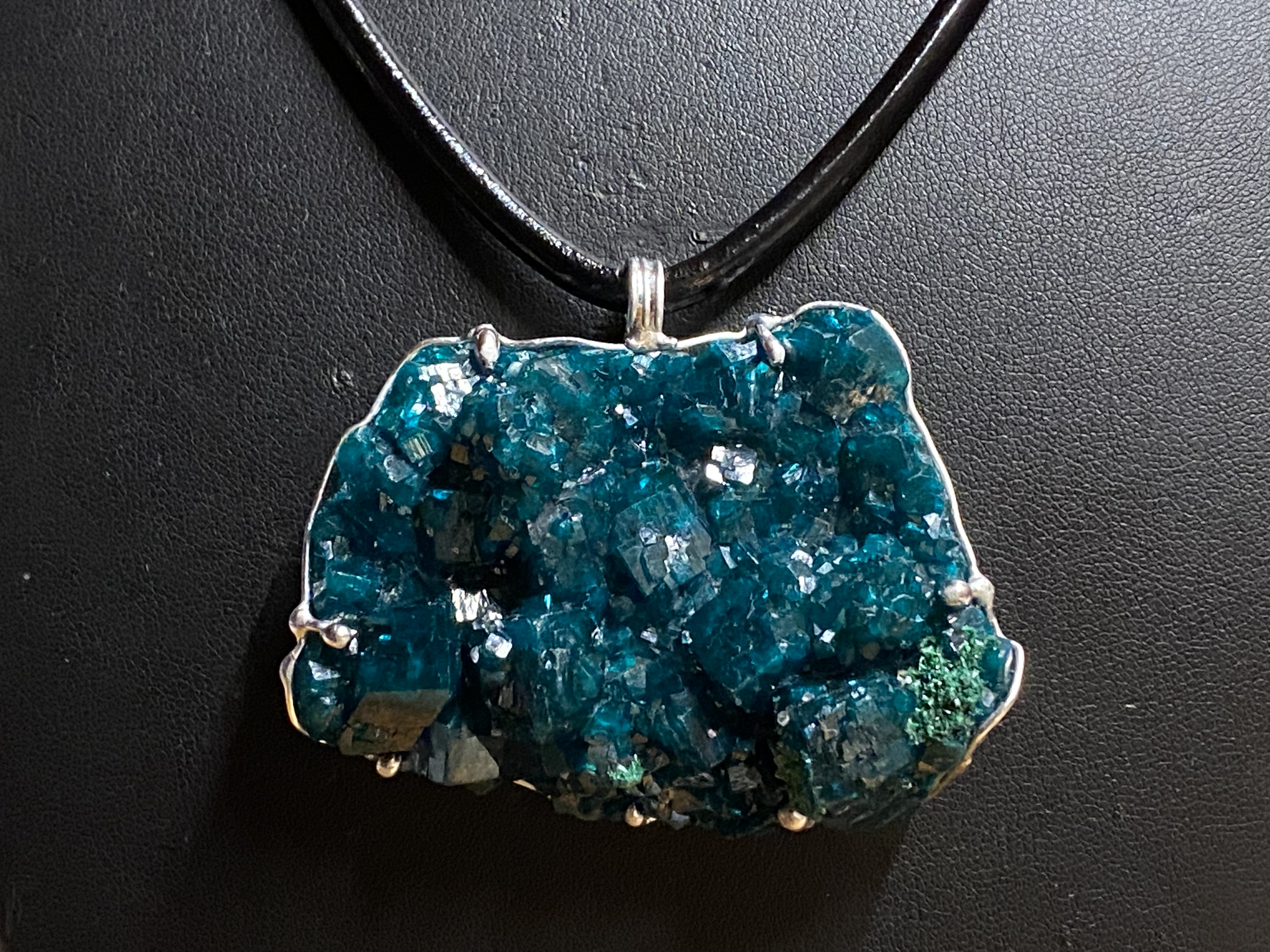 Velikost přívěsku je 4,5 x 4,5 x 1,5 cm, zavěšen na přírodní lakované kůži. Kč 3.400,-.